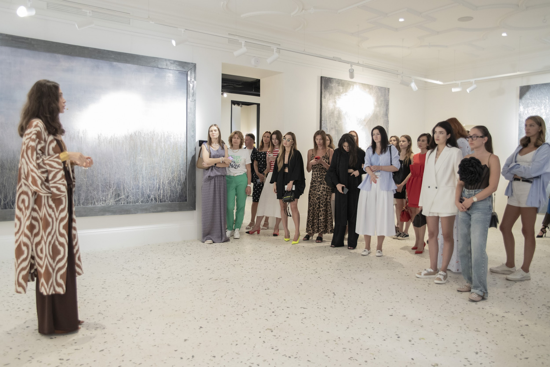 Экскурсия прошла по экспозиции MY BLOOMING SOUL, включающей работы двух российских художников – Алексея Головина и Анны Сладковой. Выставка, посвященная силе связи человека и природы, приглашает зрителей к внутреннему диалогу со своими чувствами, раскрывающимися под воздействием любви и заботы о самих себе.