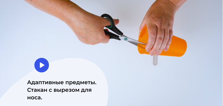 У людей с нарушением глотания при питье происходит попёрхивание, которое усиливается при запрокидывании головы. Чтобы решить эту проблему, можно купить специальную чашку с вырезом для носа. Или сделать ее самостоятельно — вырезать углубление в пластиковом стакане примерно размером с нос человека, потому что именно нос заставляет нас запрокидывать голову. Края лучше зачистить пилкой для ногтей, чтобы не поцарапать лицо.