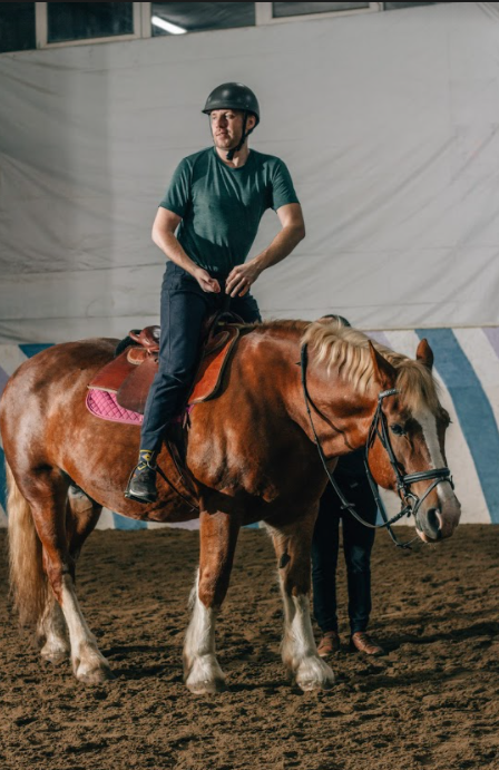 Он испытал странные смешанные чувства. Тут и страх, и восторг : он и на земле неустойчиво ходил и стоял, а тут на коне заниматься. Конь движется, нужно ловить баланс и вот тут задействовано все тело, включая и больную правую сторону. Уже через пару занятий тренер радостно отметил, что Олег уже двумя ногами привстает в стременах, хотя в начале совсем не опирался на вторую ногу.