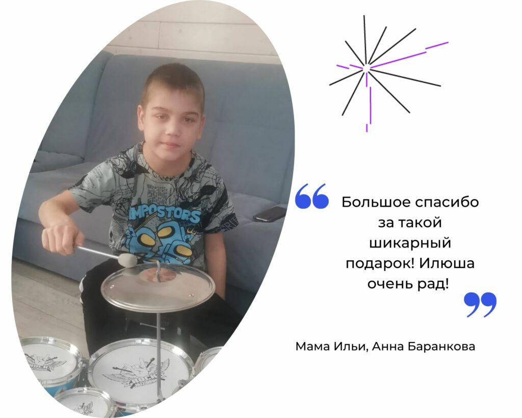 Илья Баранков 10 лет. Увлекается музыкой, в особенности барабанами, и мечтал о музыкальном инструменте. Спасибо за подарок!